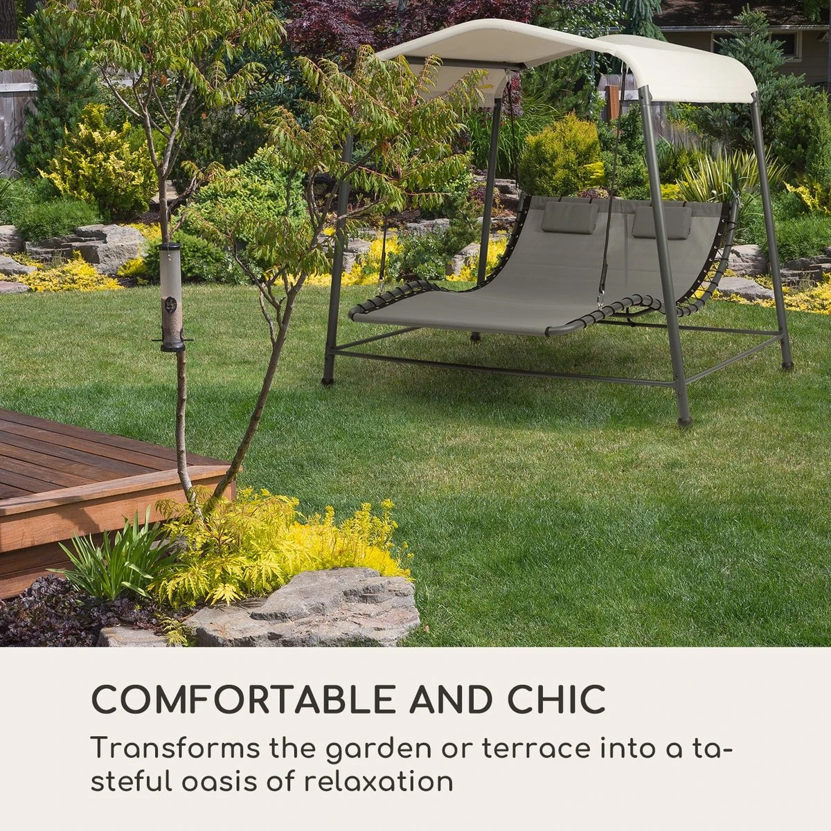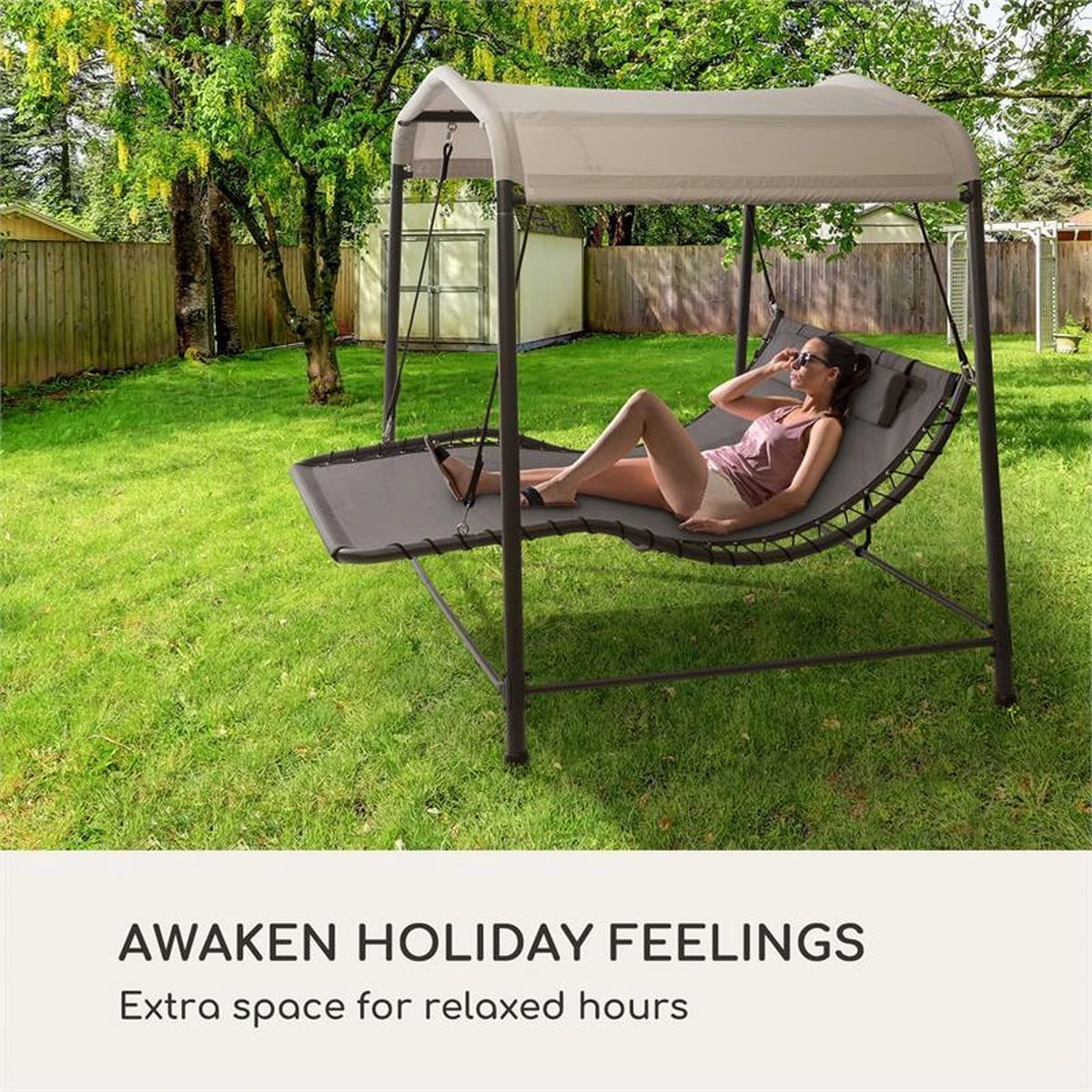 Het robuuste stalen frame geeft het blumfeldt Palermo tweepersoons schommelbed op elk moment de nodige stabiliteit en draagt moeiteloos bij aan je welverdiende ontspanning na een stressige dag. Gewoon achteroverleunen, ontspannen en wegdommelen bij de zacht schommelende bewegingen. Het ligvlak van ademend en eenvoudig te reinigen materiaal is niet alleen bijzonder resistent, maar biedt ook een royaal oppervlak van 130 x 207 cm (BxD) en veel plaats voor gezellig samenzijn. Voor individueel comfort zorgen de twee in hoogte verstelbare hoofdkussens. Het elegante design en de klassieke kleuren introduceren een vijfsterrengevoel bij je thuis. Het grote zonnedak van 200 x 144 cm (BxD), gemaakt van 180g/m² polyester, zorgt betrouwbaar voor schaduw en beschermt je zelfs tegen een regenbui. Schroeven van edelstaal garanderen daarnaast de duurzaamheid van de constructie. Het maximum gewicht van 45 kg en de 4 poten zijn verantwoordelijk voor extra veiligheid en stabiliteit.
