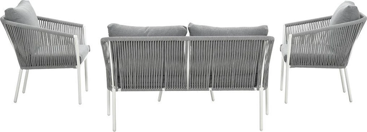 De loungeset heeft een aluminium frame, welke gecoat is. Hierdoor is de set onderhoudsvriendelijk en weerbestendig. In de arm- en rugleuning zit rope verwerkt. Dit is een kunststof touw dat een speels effect geeft aan de loungeset. Rope is een trendy materiaal wat steeds meer gebruikt wordt in tuinmeubelen. Het touw is sterk en onderhoudsvriendelijk. De meegeleverde kussens hebben een waterafstotende coating en afritsbare kussenhoezen.